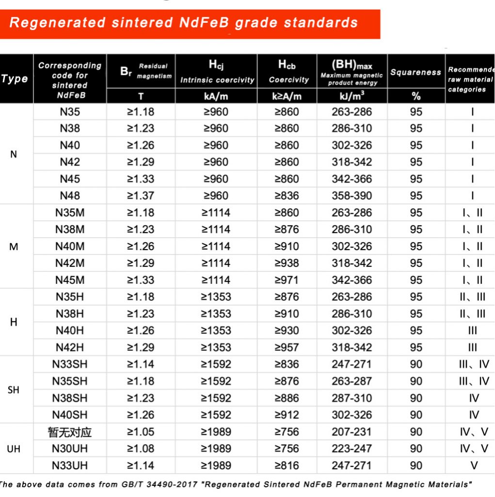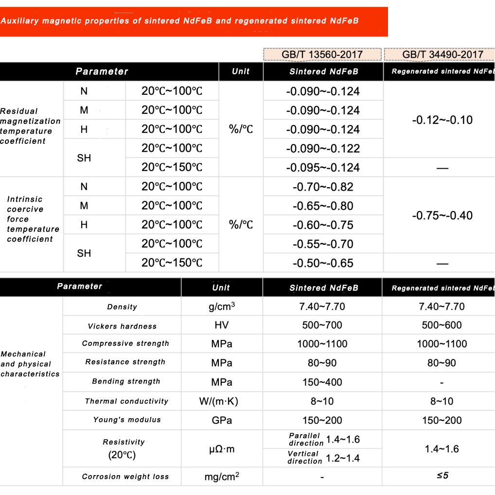 Affected by factors such as raw materials, some auxiliary magnetic property requirements for recycled sintered NdFeB can be slightly lower than those for sintered NdFeB, such as remanence, temperature coefficient of intrinsic coercivity, hardness, flexural strength, etc.