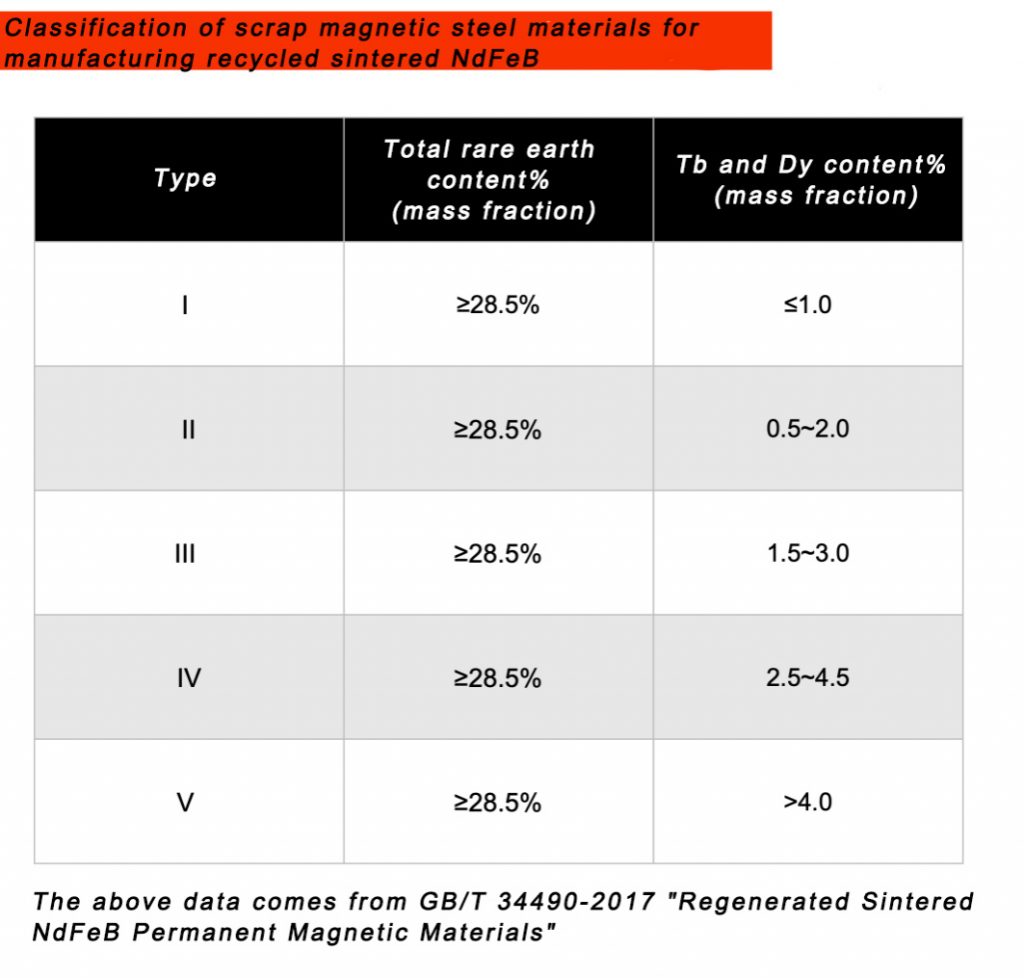 By sampling and testing the total rare earth and heavy rare earth (dysprosium and terbium) content of the scrap sintered NdFeB, the scrap materials are classified into the following five categories. Scrap sintered NdFeB materials with rare earth content less than 28.5% are not suitable for manufacturing recycled magnets.