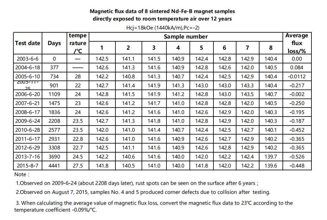 In 2013, Finnish scholars released a study showing that sintered NdFeB magnets (Hcj=15.6kOe), placed in a room-temperature environment for one year (10,000 hours), exhibited no detectable magnetization loss across samples with different Pc values (-0.33, -1.1, -3.3). The Sanyo Research Institute conducted similar measurements over more than 12 years (4441 days), using sintered NdFeB magnets (Hcj=18kOe) shaped as uncoated 10.2mm cubic samples exposed to laboratory air at temperatures ranging from 22°C to 28°C. Observations and measurements were made annually.