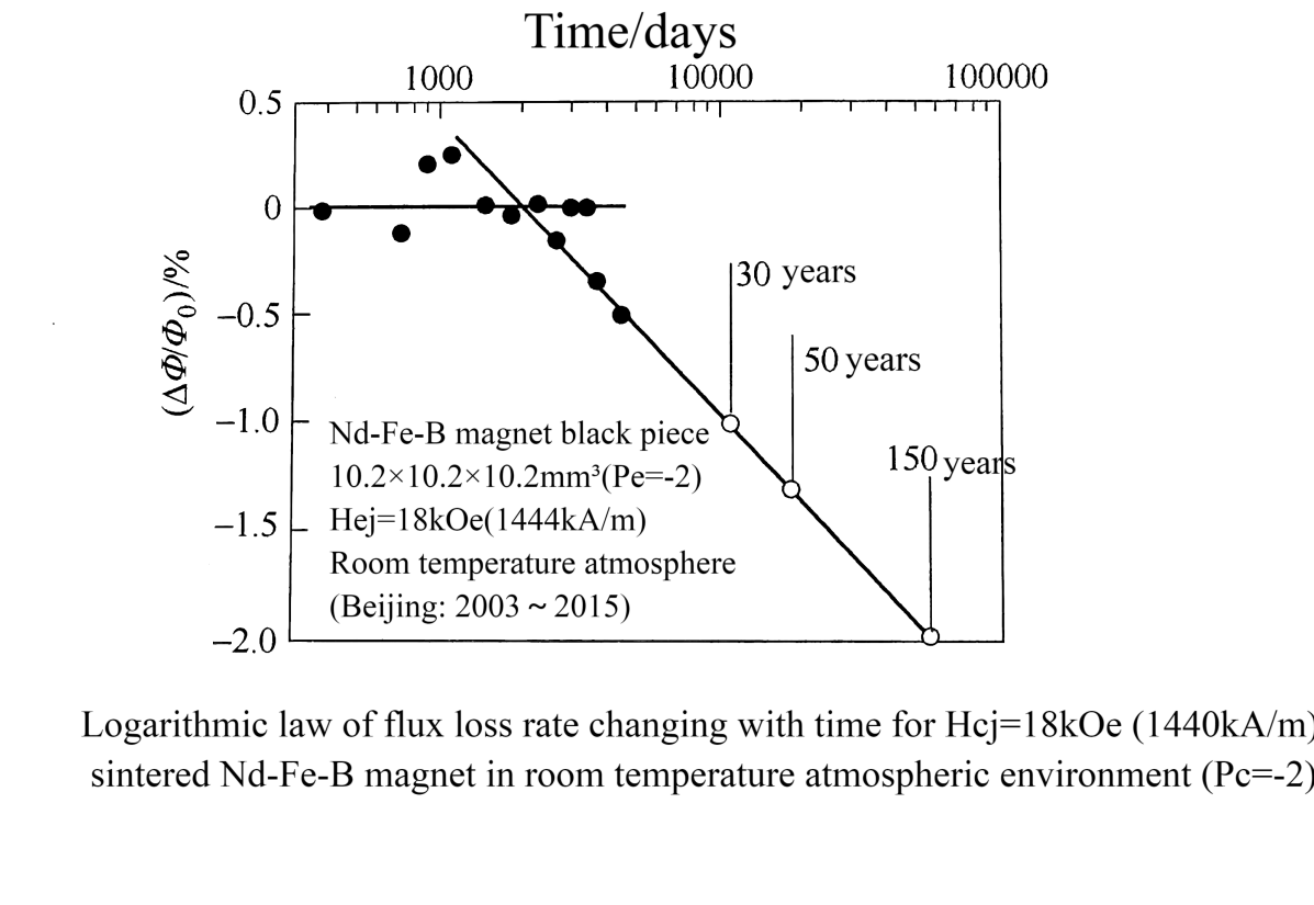 This result suggests that if the lifespan of a magnet is defined by a 5% loss rate in magnetic flux, even uncoated sintered NdFeB magnets still have a remarkably long life, conservatively estimated between 30-50 years.