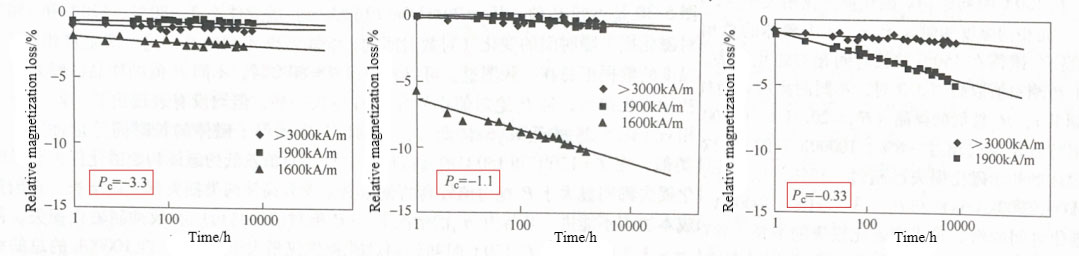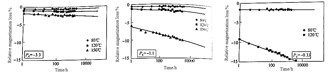 The relationship between Hcj, different Pc magnets, and their relative magnetization loss over time at various temperatures demonstrates the significant impact of Hcj on high-temperature magnetization loss. Magnets requiring high-temperature stability must possess a high Hcj, while the magnetic permeability coefficient Pc also plays a critical role in determining high-temperature long-term magnetization loss.